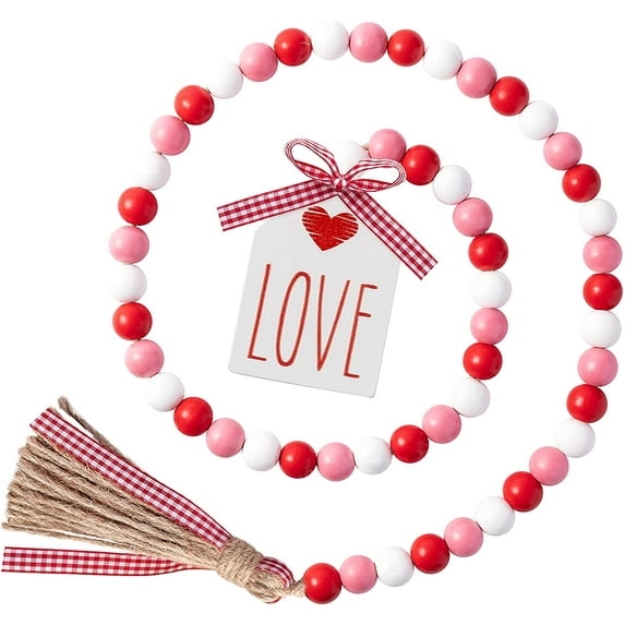2ooya Wood Beads Garland 41.2 Inch Rustic Red Pink Wood Bead with Jute Rope Plaid Love Tag Farmhouse Wood Beads Tiered Tray Dcor for Proposal Wedding Party