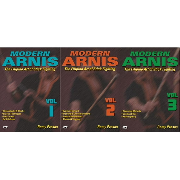 3 DVD SETGrandmaster Remy Presas takes you beyond the theory and into the real world of practical Arnis, teaching you techniques that have been tried and proved to be highly effective in real-life situations. He was one of the most relevant Arnis-Eskrima-Kali masters around the world and one of the premier stick fighters. His studies led him to combine - in one system - the best combat methods found in the different local fighting styles from the Philippines islands and named it 'Modern Arnis'. Grandmaster Presas worked with many Law Enforcement agencies around the world teaching them armed and unarmed self-defense techniques. His mastery in the several categories of the art: single stick, double stick, knife and dagger, stick and dagger and empty hand methods - brought him worldwide recognition as one of the best Arnis/Eskrima/Kali masters ever lived. Volume 1 includes stick attacks, blocking methods, evasive techniques, takedowns and unarmed self-defense techniques. (Approx. 50 min.) Volume 2 includes evasive footwork, fundamentals, blocking and checking attacks, empty-hand fighting, throwing and trapping. (Approx. 60 min.) Volume 3 includes disarming attackers, counterstrikes, proper knife techniques and using weapons to disarm an assailant. (Approx. 55 min.)