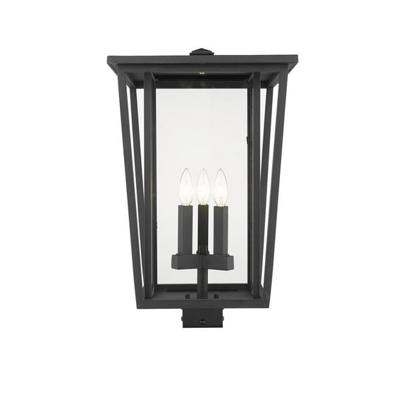 Capture the personality of fashionable outdoor design. A bold black finish frame offers a dramatic feel to this outdoor post lantern, showing off a three-light candelabra bulb base tucked behind a clear glass shade.