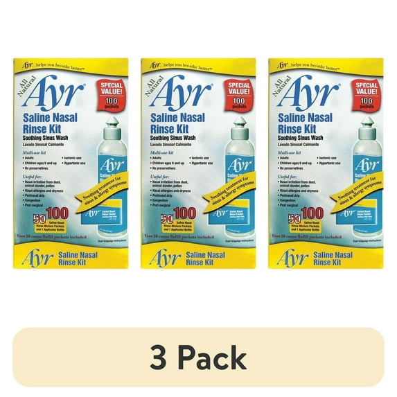 | Size | 1(3 pack) Ayr Saline Nasal Rinse Kit 100 Count | 100 Count (Pack of 1)Ayr Sinus Rinse Kit Refill Packets - 100 Count | 100 ctAYR Saline Nasal Rinse Kit, Soothing Sinus Wash, Multi-Use Kit for Adults & Children Ages 6 , 100 ct | -Ayr Saline Nasal Rinse Kit 1 Each (Pack of 4) |