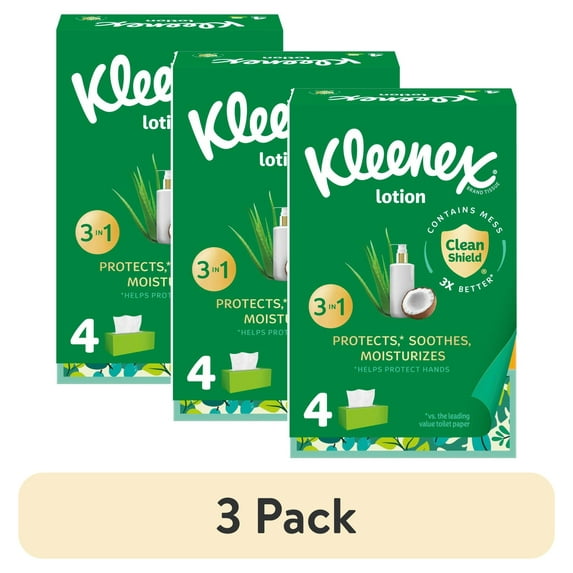 - 3-pack of Kleenex Lotion Facial Tissues with Coconut Oil, 4 Flat Boxes, 120 Tissues Per Box, 3-Ply