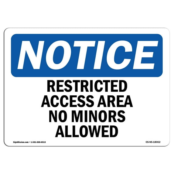 OSHA Notice Sign - Restricted Access Area No Minors Allowed | Aluminum Sign | Protect Your Business, Work Site, Warehouse & Shop Area | Made in the USASignMission 12 x 18 in OSHA Notice Sign Do Not Go Beyond This Point without Proper GrowingSignMission OS NS P 1014 L 18062 10 x 14 in OSHA Notice Sign Restricted Access Area No Minors AllowedSignMission OS NS D 710 L 18062 OSHA Notice Sign Restricted Access Area No Minors Allowed SignSignMission OS NS P 710 L 18062 OSHA Notice Sign Restricted Access Area No Minors AllowedOSHA Notice Sign Restricted Access Area Minors Allowed Plastic Sign Protect Business Work Site Warehouse Shop Area Made USASignMission Notice Restricted Access Area No Minors Allowed OSHA Aluminum SignSignMission 18 x 24 in OSHA Notice Sign No PPE Beyond This PointSignMission OS NS D 35 L 18062 OSHA Notice Sign Restricted Access Area No Minors AllowedOSHA Notice Sign Restricted Access Area Minors Allowed Plastic Sign Protect Business Work Site Warehouse Shop Area Made USAOSHA Notice Sign Restricted Access Area No Minors Allowed Decal Protect Your Business Construction Site Made in the USAOSHA Notice Signs Restricted Access Area No Minors Allowed Decal Protect Your Business Work Site Warehouse Made in the USASignMission OS NS D 1014 L 18062 OSHA Notice Sign Restricted Access Area No Minors AllowedOSHA Notice Signs Restricted Access Area No Minors Allowed Decal Protect Your Business Work Site Warehouse Made in the USA