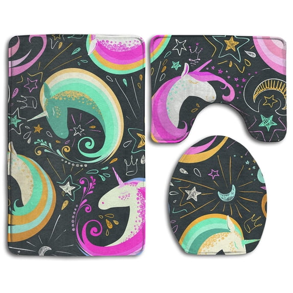 Hero image 0 of PUDMAD Unicorn Doodle Black 3 Piece Bathroom Rugs Set Bath Rug Contour Mat and Toilet Lid Cover, 0 of 2