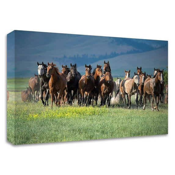"Montana Thunder" gallery wrap canvas art by Lisa Dearing, 36"x24". Horses are strong and majestic creatures. A symbol of freedom without restraint. This painting printed on thick Gallery Wrap Canvas is printed using the latest Giclee techniques on museum grade canvas. Our Giclee printer uses 12 colors to create a rich color gamut giving the deep dark and subtle highlights of an original painting. Our gallery wrap canvases are printed on 100% thick cotton canvas because we noticed that the cheap poly canvasses our competitors are using is "sagging" or "draping". 100% thick cotton canvas will loosen naturally when the wood expands, and it will shrink like fresh jeans just out of the drier when the wood shrinks. The canvas is then stretched over kiln dried finger jointed pine. With finger jointing technology the wood stays straight and strong. Finger jointed pine frames are superior to other stretcher frames because we cut around the knots and re-join the wood using the finger jointing technology. When wood expands and contracts around knotty wood it changes its shape. With finger jointing technology the wood stays straight and strong. The resulting piece of art will last for years of enjoyment.