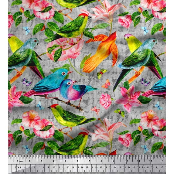 Soimoi Modal Satin Fabric Birds,Leaves & Lily Flower Printed Fabric 1 Yard 42 Inch Wide