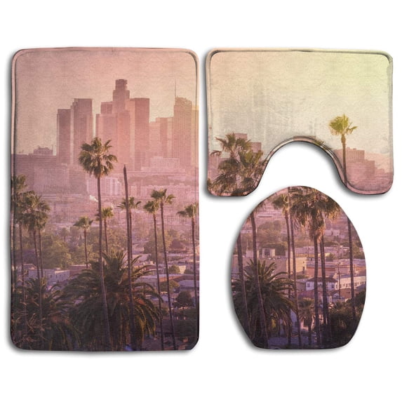 Hero image 0 of PUDMAD Sunset Skyscrapers Palm Tree 3 Piece Bathroom Rugs Set Bath Rug Contour Mat and Toilet Lid Cover, 0 of 2