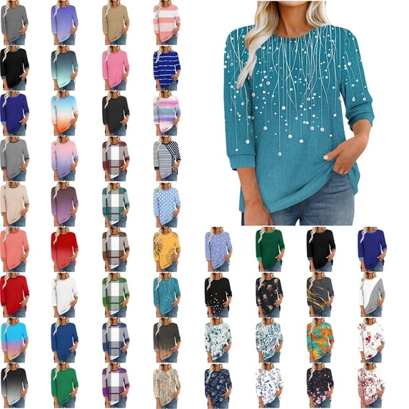 Hero image 0 of Women Blouses,Womens Tops,3/4 Sleeves Splicing Crew Neck Classic Style Solid Color,Gradient,Check,Print,Stripes Multivariant Lightweight Texture SuperSoft T-Shirt Fashion Blouse Round Neck Casual Top, 0 of 7