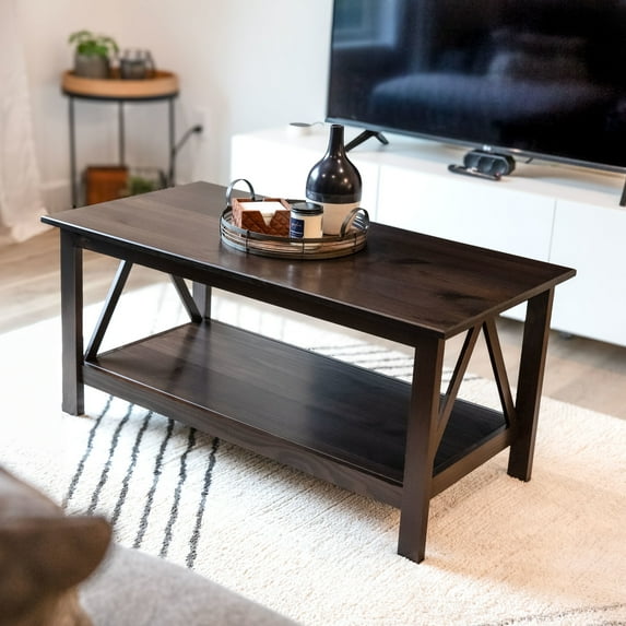 Hero image 0 of Sunnydaze Rectangular Solid Pine Wood Coffee Table with Storage Shelf, Dark Brown, 0 of 14