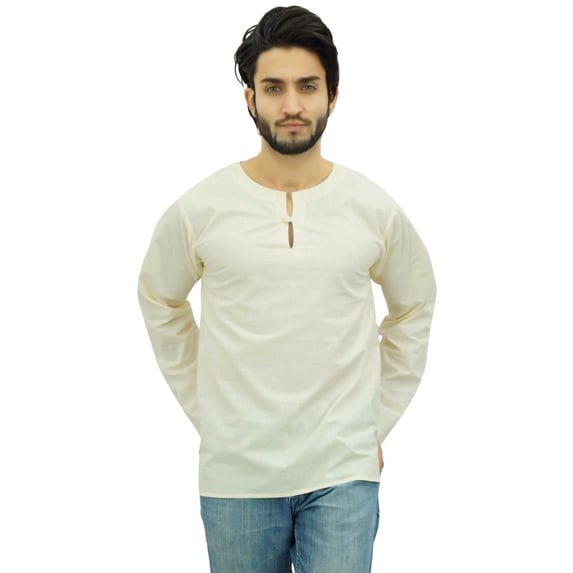 Atasi Men's Off White Short Kurta Round Keyhole Neck Cotton Shirt-Small