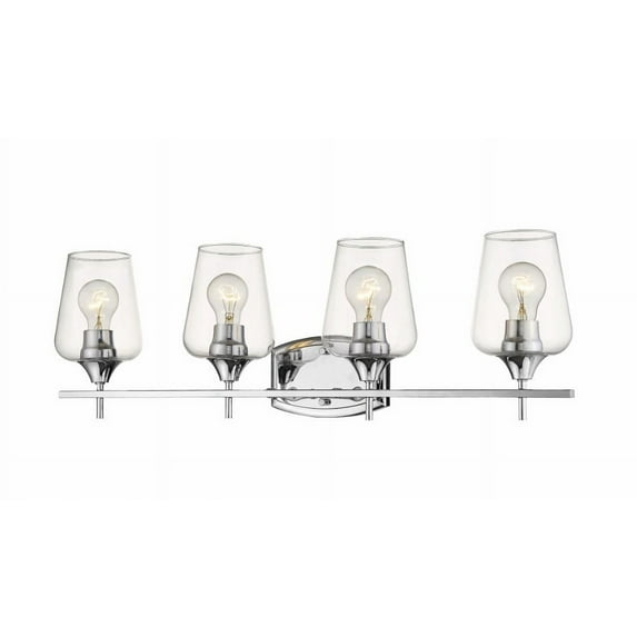 Z-Lite-473-4V-CH-Collection: Joliet, Material: Glass, Finish Color: Chrome, Width: 30", Height: 9.5", Length: 6.5", Depth: 6.5", Backplate Width: 4.5", Backplate Length: 7", Lamping Type: Incandescent, Number Of Bulbs: 4, Wattage: 100 Watts, Dimmable: Yes, Moisture Rating: Damp Rated, Desc: Upscale sophistication with a Mid Century Modern vibe tells the story of this elegant four-light vanity light. A blend of delightful materials offers stunning large glass shades with lovely Brushed Nickel finish metal, delivering a neutral palette that embellishes the look of any transitional bath space and highlights a custom vanity. Bathroom/Powder Room / Mounting Direction: Up/Down / Shade Included: Yes / Dimmable: Yes. ,-Joliet - 4 Light Bath Vanity in Shabby Chic Style - 30 Inches Wide by 9.5 Inches High-Chrome Finish