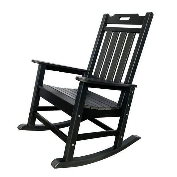 Transform your porch or patio into a haven of relaxation with this inviting 42-inch black heavy duty plastic rocking chair, offering a place to unwind and embrace the simple joys of outdoor living. Arms give this chair shape and definition and make it a good looking and comfortable option. The addition of this chair to your space will allow you to sit back, relax, and enjoy all the great outdoors has to offer.
