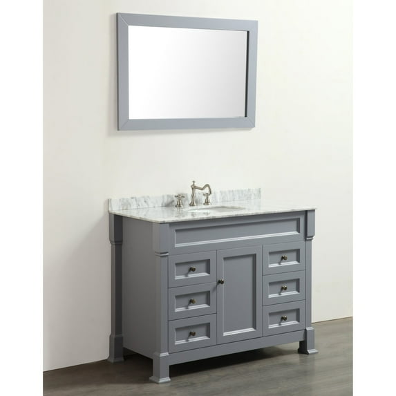 A versatile approach to design where form follows function, this Bosconi Single Vanity offers one cabinet and six drawers to provide plentiful storage space we all desire. The White Carrara Marble top and Slate Grey finish ensures durability and showcases your knack for design and style while comfortably storing your essential bathroom accessories. The perfectly suited mirror completes the set which will create a refined look in any bathroom.