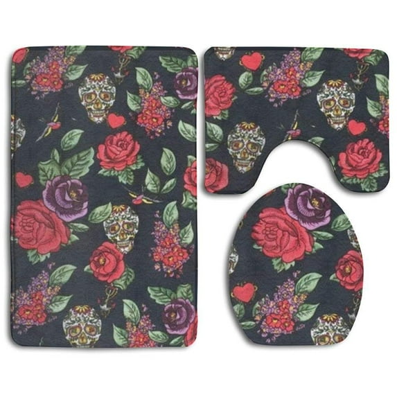 Hero image 0 of PUDMAD Sugar Skulls Roses Love Hearts 3 Piece Bathroom Rugs Set Bath Rug Contour Mat and Toilet Lid Cover, 0 of 2