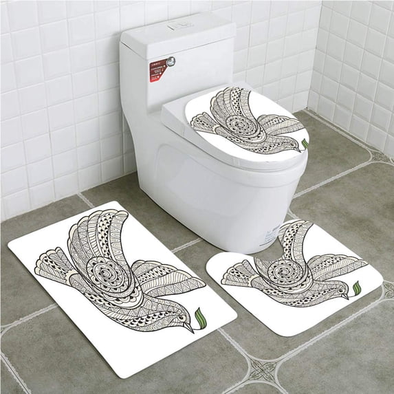 PUDMAD Stylized Dove Olive Branch Style Zen Art 3 Piece Bathroom Rugs Set Bath Rug Contour Mat and Toilet Lid Cover
