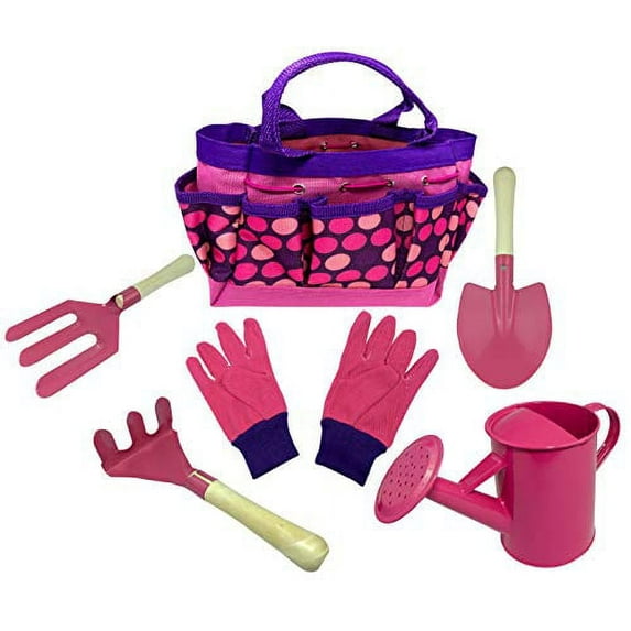 Kids Gardening Tool Set - Real Metal Child Sized Hand Tools with Wooden Handles & Safety Edges; Shovel, Rake & Pitch Fork - Plus Watering Can, Garden Gloves & Durable Canvas Carrying Bag. PinkKids Gardening Tool Set Real Metal Child Sized Hand Tools Wooden Handles Safety Edges Shovel Rake Pitch Fork Plus Watering Can Garden Gloves Durable