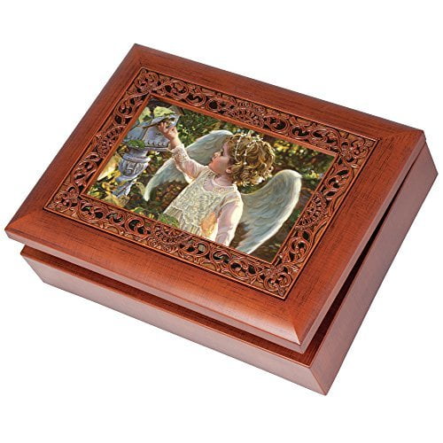 Cottage Garden Young Girl Angel in Garden Woodgrain Inlay Jewelry Music Box Plays Amazing Grace