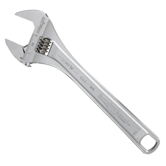 The CHANNELLOCK 810W 10" Wide Adjustable Wrench has a greater jaw capacity to support larger nuts and bolts with thinner, non-protruding jaws for greater access in tight spaces. The combination of a smart and comfortable tapered handle design, precise 4-thread knurl and minimal head width improves performance in everyday use. CHANNELLOCK Adjustable Wrenches are made in Spain and forged from rugged chrome vanadium steel.