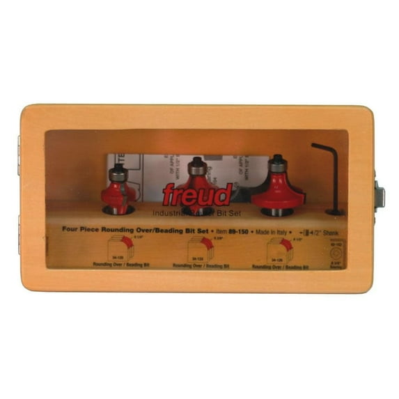 Includes (1) 89-150 Router Bit Set. 3-Piece Round Over/Beading Router Bit Sets With 1/2" Shank. Rounding over bits soften the edges of fine furniture.. Beading bits produce a simple, decorative edge on furniture & moldings. Set comes in Freud’s unique shadow box case that can hang on the wall or mount on the bench to keep bits handy and safe..