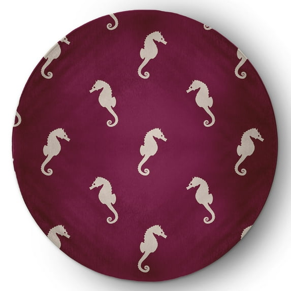 5' Round Simply Daisy Sea Horses Beach Style Chenille Area Rug, Maroon Red
