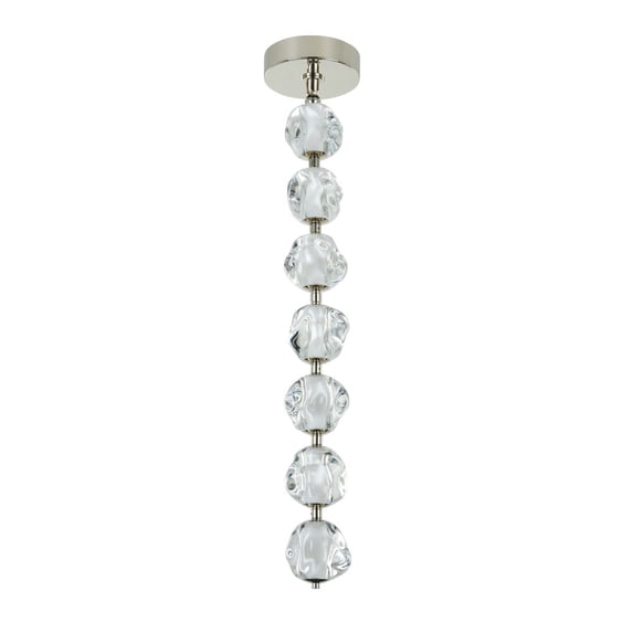 Collection: Jackie, Material: Aluminum, Finish Color: Polished Nickel, Width: 7.13", Height: 38.25", Length: 7.13", Lamping Type: LED, Number Of Bulbs: 1, Wattage: 28 Watts, Cri: 90, Color Temperature: 3000 Kelvin, Lumens: 1436, Dimmable: Yes, Desc: Inspired by the elegant luxury of a contemporary pearl necklace, the Jackie LED Collection features dimmable LED modules wrapped in beautiful organic-shaped clear acrylic globes linked together with polished nickel or brass connectors. Create a custom work of art that makes a bold statement and delivers beautiful illumination using single or multiple strands, pendants, and sconce. Surface Mount / Indoor Rated / 28 Watt Integrated LED, 3000K, 1436 Lumens, Dimmable (Included) / 1 Year Fixture/3 Year LED. , - - Jackie - 28W 1 LED Pendant In Contemporary Style-38.25 Inches Tall and 7.13 Inches Wide-Polished Nickel Finish -