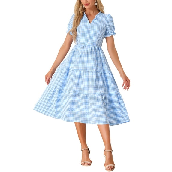 Hero image 0 of INSPIRE CHIC Women's Gingham Dress Summer Ruffle Trim V Neck Button Decor Flowy Midi Dresses XS Blue, 0 of 6