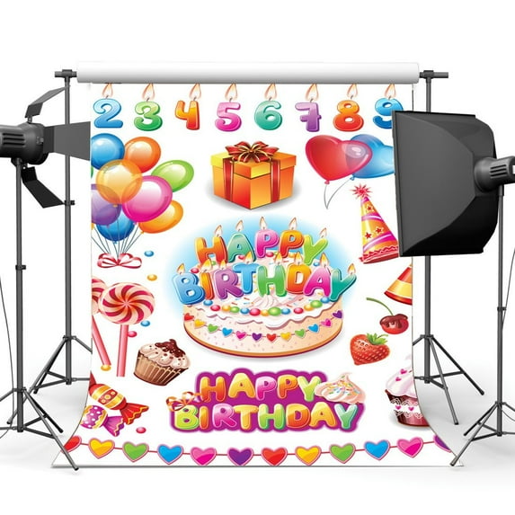 Hero image 0 of ABPHOTO Polyester 5x7ft Happy Birthday Backdrop Balloons Lollipops Sweet Hearts Gifts Cupcakes Alphabet Numbers Candles Ribbon Photography Background Baby Shower Boys Girls Party Photo Studio Props, 0 of 3