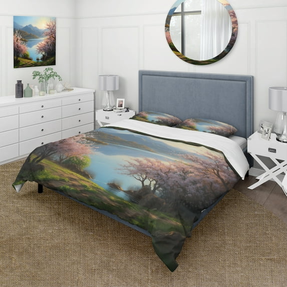 Hero image 0 of Designart "Waterside Cherry Blossom Trees I" Tree Floral Bedding Covert Set - Country Pink Landscapes Bed Set With 2 Shams, 0 of 6