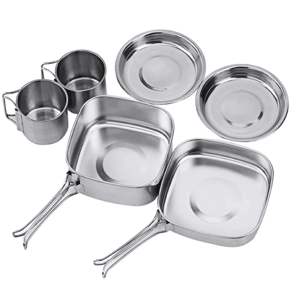 6 Piece Portable Stainless Steel Cooking Set A compact and versatile solution for cooking on the go. Made from durable stainless steel, this set includes six essential kitchen tools for your convenience. Perfect for camping and outdoor activities, this portable set allows you to boil, grill, fry, and sauté with ease. Experience the durability and functionality of this stainless-steel cooking set wherever you are. - Conducts heat quickly - Stainless steel material is sturdy - Fitted together (with the lid on the pot) - Both the pot and pan have folding handles - The long handles work well for holding while eating.- Suitable for 1-2 people to cook a wide range of food. - Excellent camp kitchen cookware equipment for camping, hiking, backpacking and other outdoor activities Color: silverMaterial: Stainless steel Weight: 1.4 lbs.Size about: lunch box 5.7 x 5.7 x 2.8 in. Package Contents:2 x Pots2 x Reel Edge Plates2 x Mugs 1 Carry Bag For more Product selections go to (https://acampx.com) Then click store