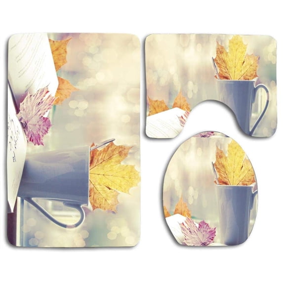 PUDMAD Book and Tea Cup 3 Piece Bathroom Rugs Set Bath Rug Contour Mat and Toilet Lid Cover