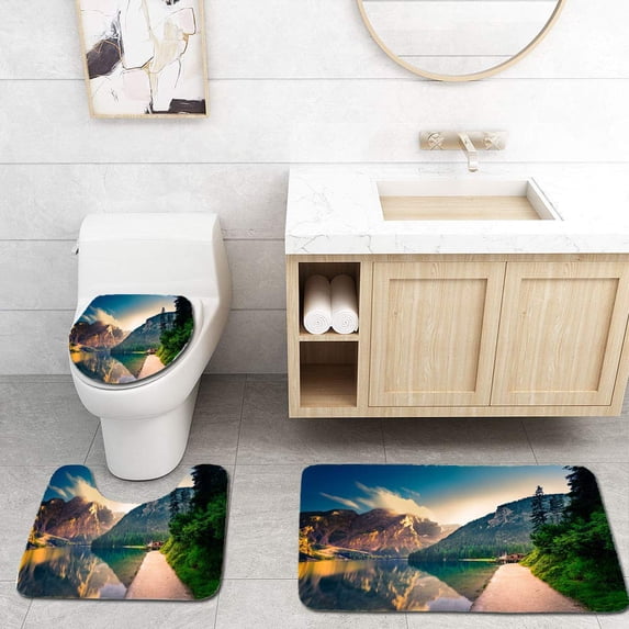 Hero image 0 of PUDMAD Spectacular Romantic Place Typical Wooden Boats on Alpine Lake Lago di Braies Braies 3 Piece Bathroom Rugs Set Bath Rug Contour Mat and Toilet Lid Cover, 0 of 2
