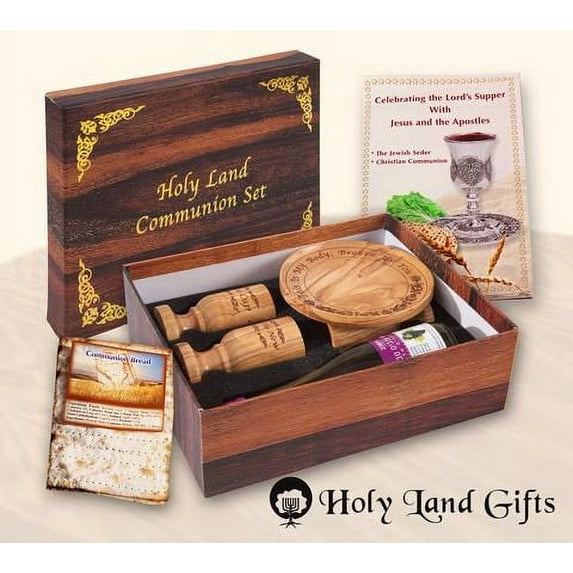 Communion-Set-Olivewood Plate  2 Cups  Juice & Matza In Box
