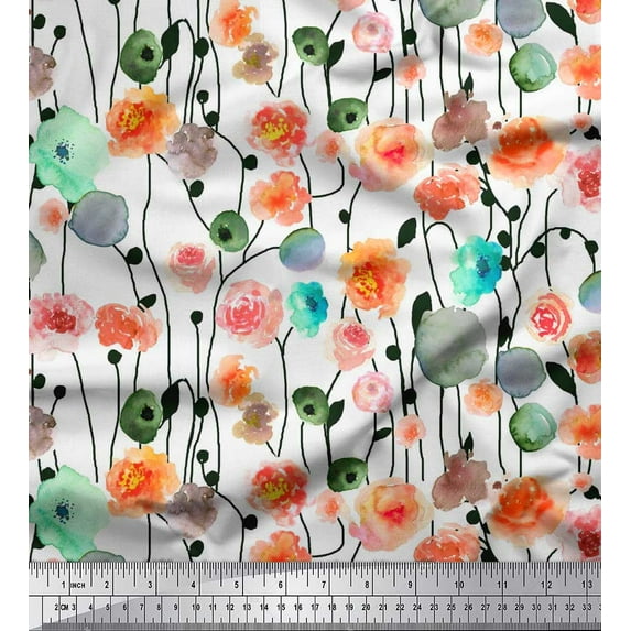Soimoi Cotton Voile Fabric Leaves & Rose Watercolor Print Fabric by the Yard 56 Inch Wide