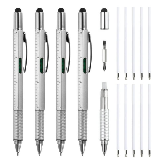 4pcs 6 in 1 Multitool Tech Tool Pen Gifts for Men with Ballpoint Pen, Ruler, Screwdriver, Stylus, Silver