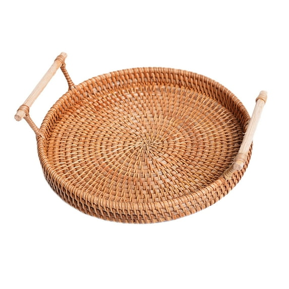 WAXIAYU Round Rattan Serving Tray with Handles Ottoman Platter Hand- Woven Wicker Storage Plate for Breakfast Drinks Snack Fruit Vegetables Size