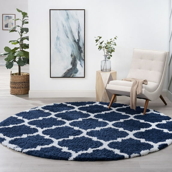 Bliss Rugs Shag Transitional Geometric Round Rug for Living Room, Dining Room | Navy, 5'3''Round