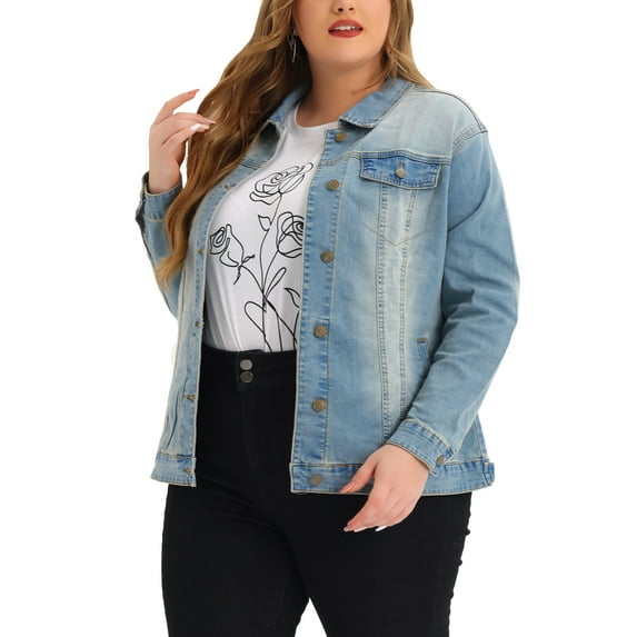 Agnes Orinda Women's Plus Size Jean Jacket Stitching Button Washed Denim Outerwear Coat 1X Light Blue