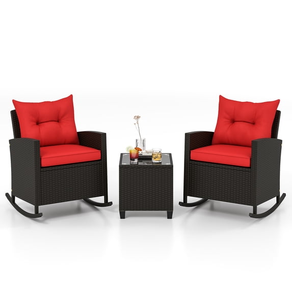 Gymax Set of 3 Wicker Rocking Set w/ Tempered Glass Table Patio Outdoor RedGymax Set of 3 Wicker Rocking Set w Tempered Glass Table Patio Outdoor RedGymax Set of 3 Wicker Rocking Set Patio w Tempered Glass Table Soft Cushions NavyGymax Set of 3 Wicker Rocking Set w Tempered Glass Table Patio Outdoor Black