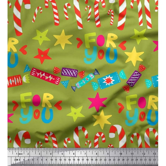 Soimoi Green Modal Satin Fabric Star & Candy Cane Party Decor Fabric Printed Yard 42 Inch Wide