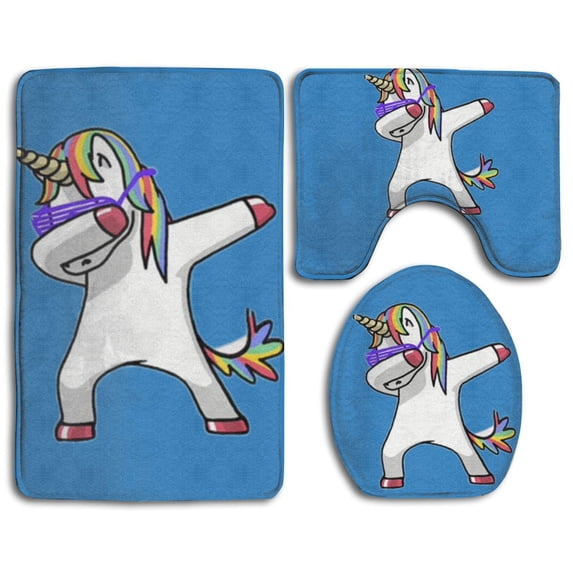 PUDMAD Dabbing Rainbow Unicorn 3 Piece Bathroom Rugs Set Bath Rug Contour Mat and Toilet Lid Cover