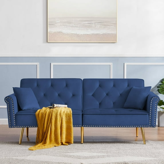 Hero image 0 of 76.7" Accent Sofa, Velvet Tufted Futon Sofa Couch with Two Soft Pillows, Loveseat Sofa with Nailhead Trim and Gold Mental Legs, Convertible Folding Sofa Bed, for Compact Spaces, Blue, 0 of 7