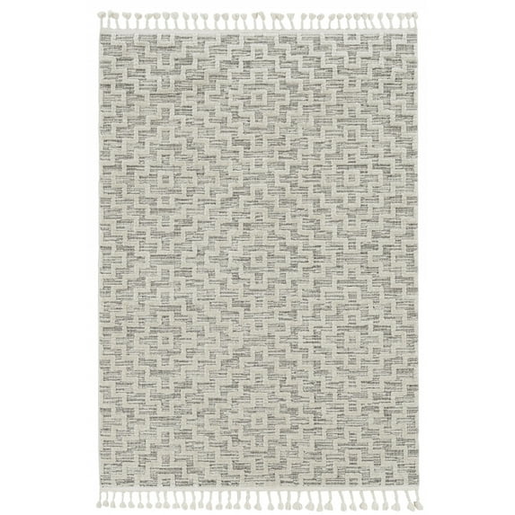 8' Ivory Grey Machine Woven Geometric With Fringe Indoor Runner Rug