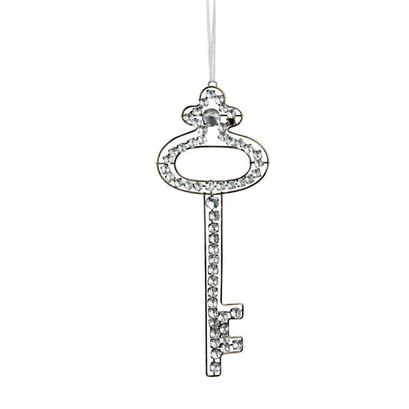 Metal key ornament has an antique finish and is covered in sparkling clear rhinestones One-sided ornament Comes ready-to-hang on silver ribbon Dimensions: 9"H x 3.5"W x 0.25"D Material(s): plastic/metal
