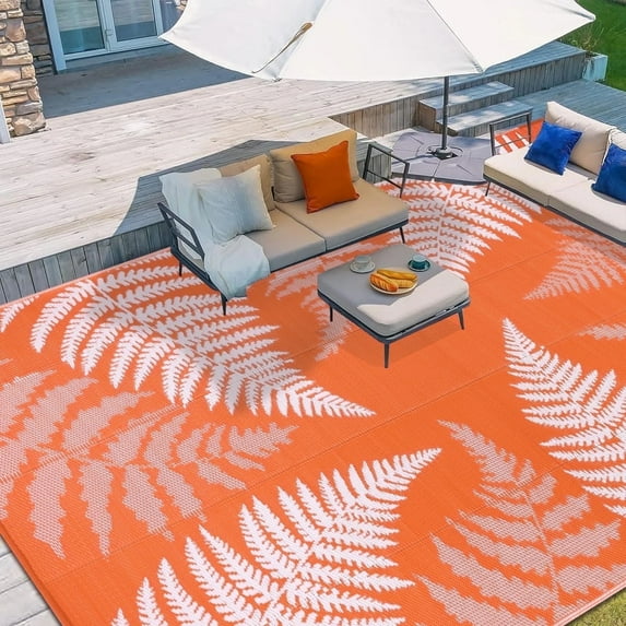 Hero image 0 of 9'x12' Outdoor Rugs for Patios, Yamaziot Patio Rug RV Mats, Waterproof Reversible Plastic Straw Camping Rug for Deck Porch Balcony Beach Tropical, Palm Leaf Orange, 0 of 8