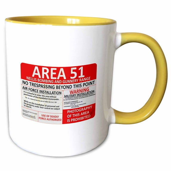 3drose, a Satire Government Base Sign Warning No Trespassing in Area 51., 11oz Two-tone Yellow MugA Satire Government Base Sign Warning No Trespassing In Area 51 11oz Two Tone Yellow MugA Satire Government Base Sign Warning No Trespassing In Area 51 15oz Two Tone Black MugA Satire Government Base Sign Warning No Trespassing In Area 51 15oz Two Tone Green MugA Satire Government Base Sign Warning No Trespassing In Area 51 15oz Two Tone Blue Mug