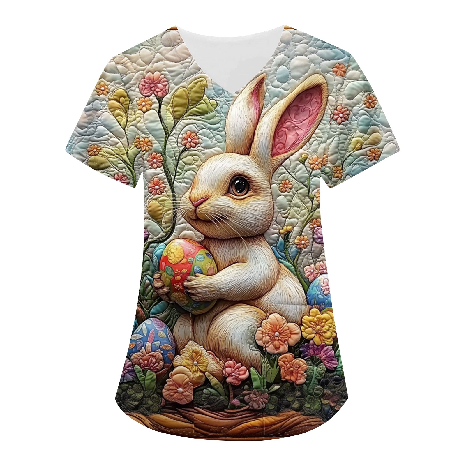 Hero image 0 of ADSSDQ Easter Scrub Tops Women Stretchy Vneck Short Sleeve Cute Bunny And Eggs Printed Nurse Working Uniforms with 2 Pockets Beige 2XL, 0 of 6