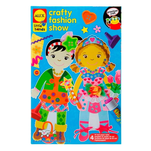 ALEX Toys Little Hands Crafty Fashion Show is a rainy day runway project for future fashion designers! Use crafting supplies to design and create outfits for your cardboard models and send them down the runway. Great activity for a small group or one little fashionista who wants to design a whole collection. Includes 4 cardboard dolls, 20 stickers and shapes, 29 tissue papers, 4 pipe cleaners, 3 ribbons, 5 pieces of ric rac, 3 sheets of fringed paper, 3 buttons, a doily, glue stick (4.4oz. / 40g.), 8 crayons, a craft stick and picture instructions. Recommended for children 3 years of age and older.