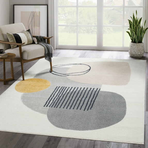 Discover the perfect mix of soothing colors and contemporary style with our Abani Deco Collection Area Rugs. This 2 x 3 modern masterpiece, woven with care and precision, showcases an understated elegance with its interwoven circles and lines. The color palette, a soothing blend of cream and grey with a vibrant pop of yellow, makes it a versatile accent rug that harmonizes with mid-century decor. Crafted with busy households in mind, our rectangle-shaped area carpet is a testament to durability and easy maintenance. Made with stain-resistant materials that guard against spills and mishaps, it’s a practical Indoor Rug for your home office or entryway. Plus, its non-shed, fade-resistant qualities ensure that the rug's beauty endures, offering you a lasting floor covering. Whether you’re looking for a larger living room rug, dining room rug, nursery rug, or a small rug for the kitchen, or bedroom, our rug collection has something for everyone. So hurry and add a touch of style and sophistication to your home with this modern abstract rug from the Abani Deco Collection. Size: 2’ x 3’ (24" x 36"). Medium Pile Height of 0.4". Shape: Rectangle. Weight: 4 lbs. Colors: Cream Grey Yellow.- 2' x 3' AREA RUG - Add a touch of artistic flair to your floors with the Deco Collection. This minimalist-designed 2x3 rug features interwoven circles and lines with neutral tones of cream, grey, and a pop of yellow. Its subtle colors and contemporary style create a unique floor rug that blends with all types of decor. More than just a rug, it's a stunning modern rug for your home.