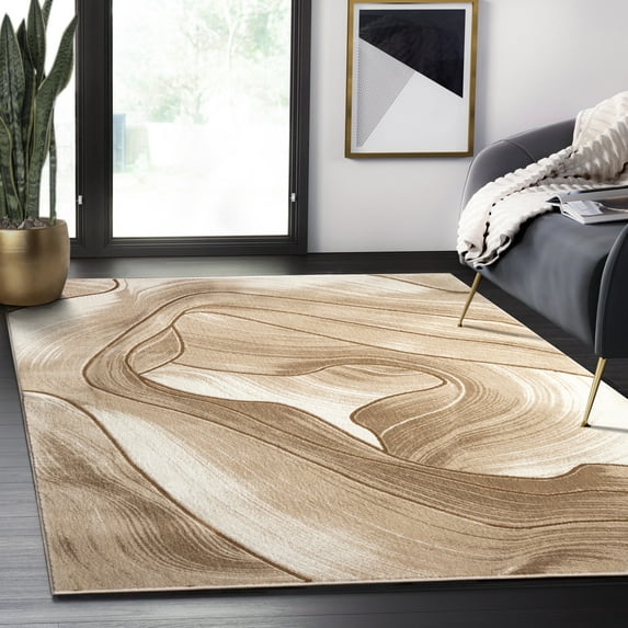 Discover the perfect mix of traditional and modern style with our Abani Luna Collection Area Rugs. This 6 x 9 masterpiece, woven with care and precision, introduces a unique blend of boldness and delicacy to your home decor. Its swirling light brown and ivory design, reminiscent of an unfurling flower petal or a ribbon in motion, captivates with its endless flow. The Accent Rug’s subtle shading and delicate lines of gold add another element of luxury. Crafted with busy households in mind, our rectangle-shaped area carpet is a testament to durability and easy maintenance. Made with stain-resistant materials that guard against spills and mishaps, it’s a practical Indoor Rug for your home office or entryway. Plus, its non-shed, fade-resistant qualities ensure that the rug's beauty endures, offering you a lasting floor covering. Whether you’re looking for a larger living room rug, dining room rug, nursery rug, or a small rug for the kitchen, or bedroom, our rug collection has something for everyone. So hurry and add a touch of style and sophistication to your home with the Abani Luna Collection Modern Abstract Rug. Size: 6' x 9' (72" x 108"). Medium Pile Height of 0.4". Shape: Rectangle. Weight: 24 lbs. Color: Brown Ivory.- 6' x 9' AREA RUG - Add a touch of artistic flair to your floors with the Luna Collection. The design on our luxurious 6x9 rug is similar to an unfolding flower petal or a ribbon in motion. The pattern merges with shades of light brown and ivory highlighted with subtle gold accents. Its colors and contemporary style create a unique floor rug that blends with all types of decor. More than just a rug, it's a stunning modern rug for your home.