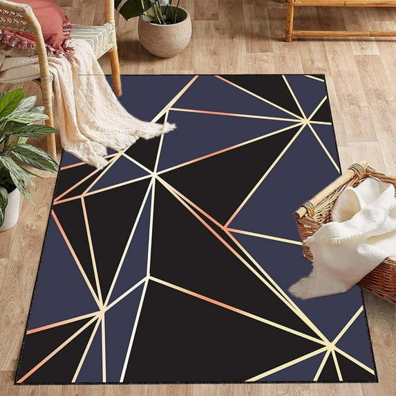 Abstract Black Blue Area Rug, Poly Design Rug, Geometric Rug, Abstract Rug, Gold Patterned Rug 5x6ft