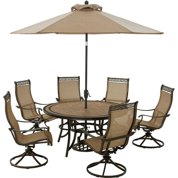 Create an elegant space to dine outdoors with the Monaco 7-piece dining set by Hanover. This carefree outdoor dining set includes a 60-in. tile-top dining table, six sling swivel rockers, 9-ft. market umbrella and coordinating umbrella stand. The heavy-duty aluminum frames are coated in a protective golden-bronze finish, and the dining chairs are constructed with premium PVC sling fabric to provide unprecedented durability and comfort. The neutral-toned fabric fits perfectly with any surrounding, in addition to being moisture-, stain- and UV-resistant. Each swivel chair performs a smooth, 360-degree spin rocking motion. The grouted tile tabletop completes the look and offers spacious room for food and drinks. To keep your guests cool and comfortable in the shade, the sturdy umbrella has an adjustable tilt. Built to last, this trendy dining set will enhance the look of any outdoor living space without requiring any additional maintenance.